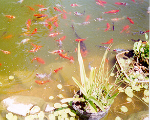 This spring (1996) after the snow and ice cleared and it rained several times, the water was so clear that I could see to the bottom of the deep end (4.5 ft). Then about 3 weeks later, with the warmer weather and sunshine, the algae started growing again. There seems to be a lot of opinions about how much algae should be in a fish pond. Of course there is not a whole lot we can do to easily adjust this artificially. After several years of experience now, I am happy to let the algae go through its' yearly cycle. From clear (in the late fall and winter & early spring and summer) to green (in late spring to early summer & late summer to fall.) This spring (May,1996) the Belted King Fisher has discovered that he can catch fish in the pond and fortunately the water is getting green to make it harder for him to see the fish. My mother was looking out of the window one day and saw a splash and out came the King Fisher with a goldfish in it's beak. Eventually the lotus, lilies and nymphoides will cover a large part of the surface which will give the fish a place to hide and also shade the water which will clear up the algae.