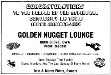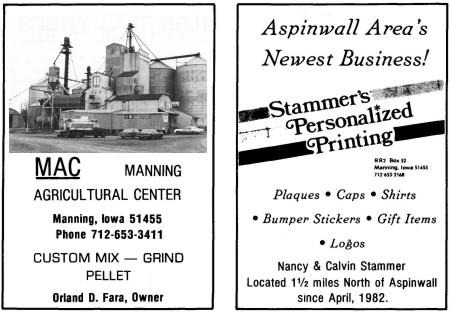 Frank and Helen Kasparbauer moved to the former Guth farm one mile west and 1/2 mile north of Aspinwall in 1973. A quarter mile south of the Kasparbauer farm live William and Teresa A. Wanninger, who have lived there since 1953. Across the road to the east were Katharina (Mueller) Brandt and her children, Joe and Rosie. Katharina and her husband Joseph moved to the farm in 1931; she died April 25, 1982.