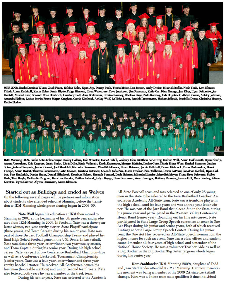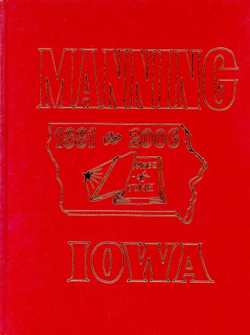 This 2006 Manning Quasquicentennial history book is an update to the 1981 Manning Centennial History Book. There are approximately 20 pages on city government, 11 pages on churches, 60 pages on the Manning school and Manning sports, 30 pages on entertainment & service organizations, 40 pages on Manning Veterans, 70 pages on Manning businesses, 10 pages showing the business layout and history of each building on Main Street, 10 pages on agriculture, over 200 pages on Manning's families, with the balance of pages composed of 100 year old Manning Monitor excerpts, random pictures, Manning nicknames, and advertisements. This 480 page history book is sewn bound with a hard cover and has excellent quality paper to give the best print for text and image quality for pictures. Many books of this quality would cost $60 to $100 but now the extra copies are on sale for $20 plus shipping. Nearly 100 volunteers worked on this history book project which was started before 2000. |
