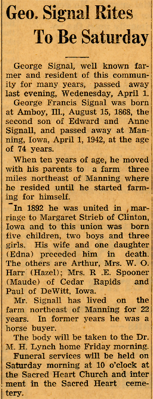 charge of the Rev. Father Poeckes, with burial in the Mount Olive Catholic Cemetery, in Carroll. Pallbearers
