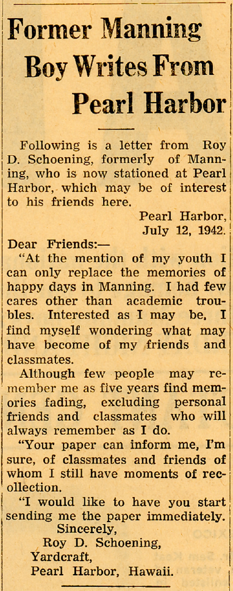 How many small communities do you know have published 5 history books? The first one was the History of Manning 1898, then the 1981 Manning Centennial book, next the 2006 Manning Quasqui book, and most recently the 2009 Manning School history book. Probably the last book to be published will be the upcoming Manning Veterans' book - unless someone comes forward in the next generation to take over these projects after I'm gone. Will you help with the Veterans' history book project? If you are a Manning connected Veteran or are presently serving and do not submit your military connected pictures and infomation you probably won't be in this once-in-a-life-time Manning Veterans' history book. With a limited number of volunteers we can only do so much on our own but will try to get pictures of as many Veterans as we can. There are over 1000 Manning Veterans so we have a long ways to go before the book can be published.