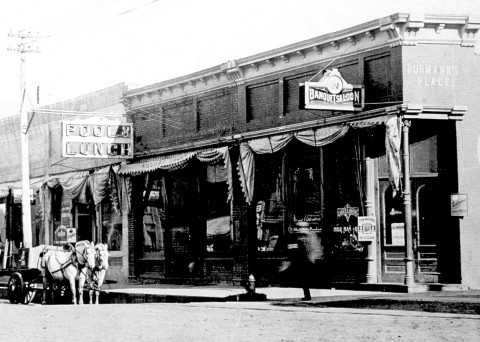 Corner Cafe is to the right (Gruhn business in middle) and the building to the left is another saloon.
