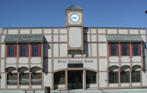 Basement: On the north side of the First National building there was a board walk with railing that went along the wall to the NW corner. In the first floor NW corner of the building was Giddings Millinery.