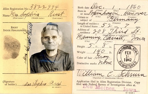 Herman Hagedorn married Ann Vinke and they had 3 children: Norma, Barbara, and Donald. Sophie Rust emigrated to Manning in 1942 and below is her alien registration card. She came from Popenhagen, Hanover, Germany.