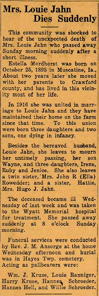 She was born Stella Mordhorst at Muscatine, October 25, 1895. She was married to Louie Jahn at Manning, March 8, 1916. All her married life she lived on the farm where her last rites will be held Wednesday. She was baptized in the Lutheran faith. Survivors include her widower, two daughters, Irene and Ruby, two sons, Jimmy, and Wayne, all at home, her twin sister, Mrs. John Rowedder, also Mrs. Hugo Jahn and brother, Ed Mordhorst, all living near Manning.