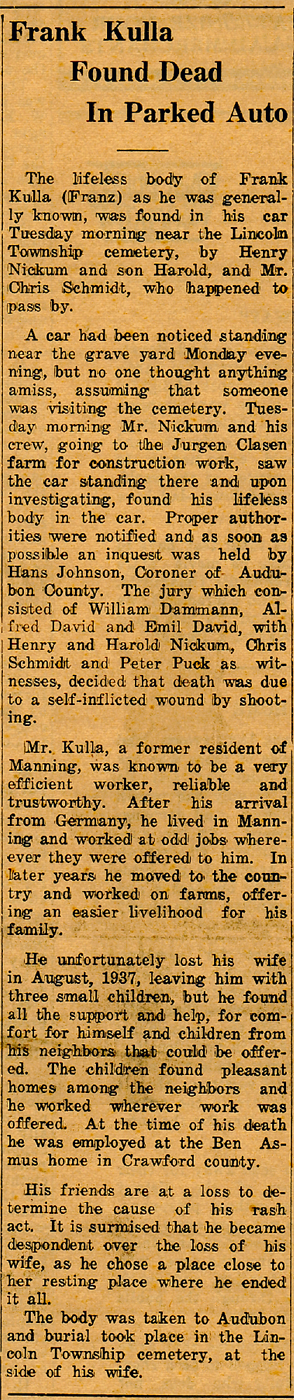 A car had been noticed standing near the graveyard Monday evening, but no one thought anything amiss, assuming that someone was visiting the cemetery. Tuesday morning Mr. Nickum and his crew, going to the Jurgen Clasen farm for construction work, saw the car standing there and upon investigating, found his lifeless body in the car. Proper authorities were notified and as soon as possible an inquest was held by Hans Johnson, Coroner of Audubon County. The jury which consisted of William Dammann, Alfred David and Emil David, with Henry and Harold Nickum, Chris Schmidt and Peter Puck as witnesses, decided that death was due to a self-inflicted wound by shooting.