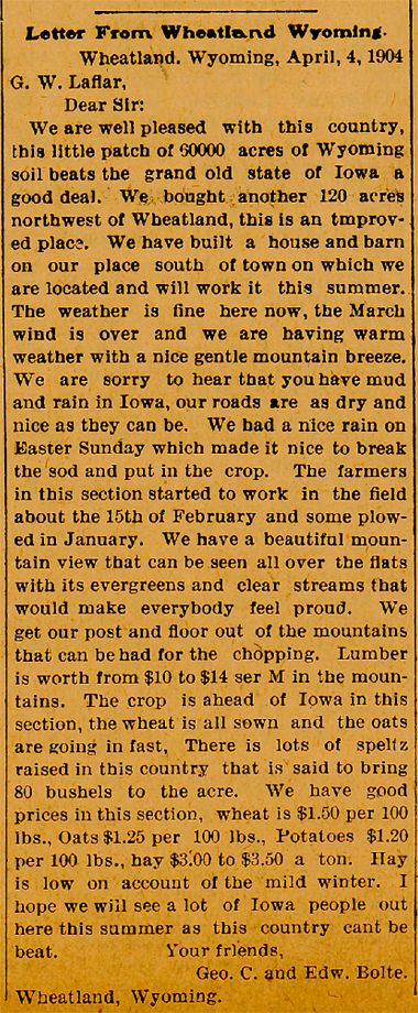 The deceased was a highly respected young man and made many friends during his short residence in Wheatland, he having moved from Manning, Iowa, to this place over a year ago. He was born April 15, 1877.