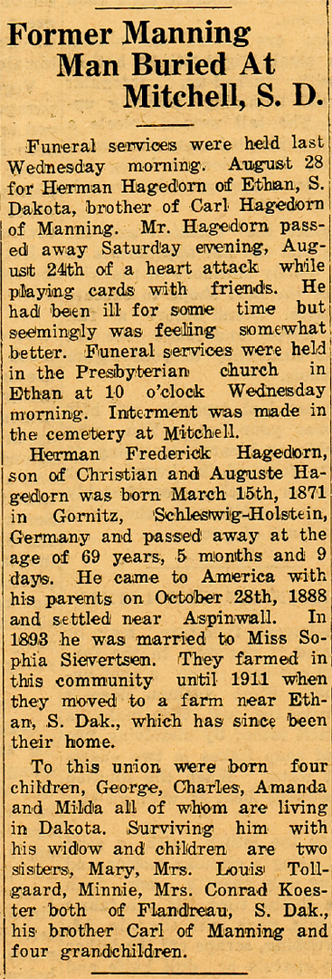 Herman Frederick Hagedorn, son of Christian and Auguste Hagedorn was born March 15th, 1871, in Gornitz, Schleswig-Holstein, Germany and passed away at the age of 69 years, 5 months and 9 days. He came to America with his parents on October 28th, 1888, and settled near Aspinwall. In 1893 he was married to Miss Sophia Sievertsen. They farmed in this community until 1911 when they moved to a farm near Ethan, South Dakota, which has since been their home.