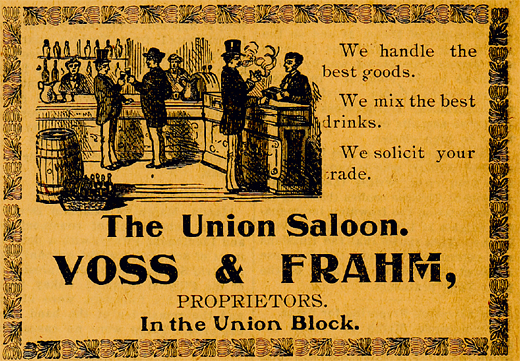 Mrs. Frahm joined hands in holy matrimony with Mr. Johannes Hansen and they continued farming on the same place and later moved to a farm near Botna. At this place they farmed until 1891 when Mr. Hansen and family moved to Manning where they purchased a business and Mr. Frahm assisted his stepfather for a number of years. He later accepted a position with C.H. Reinholdt in the hardware business, which position be kept until 1901 when he purchased the business of Claus Eden and formed a partnership with, Carl Voss. This firm was active in business and widely known for many years until the prohibition law broke up many homes and businesses that were organized under the Mulct law in Iowa.