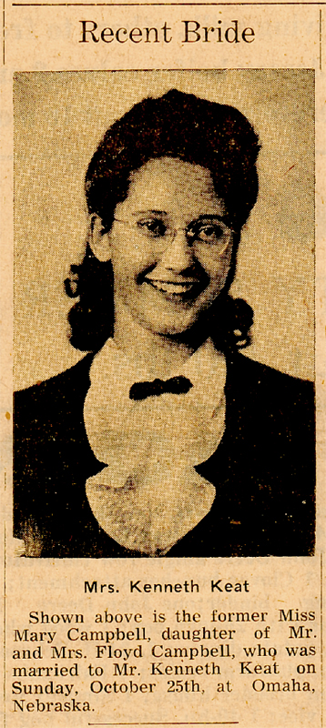 Mary was born in Manning, Iowa, and received her education in the Manning Community School where she graduated in 1941. After completing her education she taught school for a short time in a rural Manning School. On October 25, 1942, Mary was united in marriage to Kenneth Keat in Omaha, Nebraska. The couple made their home on a farm near Manning, until purchasing a farm near Manilla. They were blessed with the birth of five children.