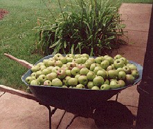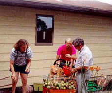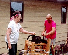 In 1993 I purchased a cider press (American Harvester by Happy Valley Ranch). The first year I cranked the grinder by hand, but it didn't take me long to put an electric motor on the press. Here you see my mother and I getting ready to press the first batch of cider. |