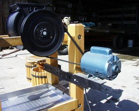 The pulley on the motor is 2 inches and the pulley on the grinder shaft is 10 inches. This gives a nice and relatively safe speed to grind the apples into pulp. |