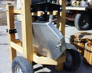 In 1995 I had a local welding shop make me a Stainless Steel insert which fits in the bottom of the wooden platform. This Stainless Steel pan is easy to clean and protects the plywood base where the pressing tubs sit.