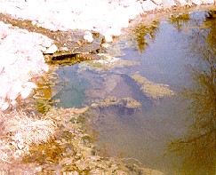 This spring (1996) after the snow and ice cleared and it rained several times, the water was so clear that I could see to the bottom of the deep end (4.5 ft). Then about 3 weeks later, with the warmer weather and sunshine, the algae started growing again. There seems to be a lot of opinions about how much algae should be in a fish pond. Of course there is not a whole lot we can do to easily adjust this artificially. After several years of experience now, I am happy to let the algae go through its' yearly cycle. From clear (in the late fall and winter & early spring and summer) to green (in late spring to early summer & late summer to fall.) This spring (May,1996) the Belted King Fisher has discovered that he can catch fish in the pond and fortunately the water is getting green to make it harder for him to see the fish. My mother was looking out of the window one day and saw a splash and out came the King Fisher with a goldfish in it's beak. Eventually the lotus, lilies and nymphoides will cover a large part of the surface which will give the fish a place to hide and also shade the water which will clear up the algae.