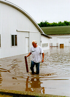 | Here Ron Morlok inspects the damage from the second flood of 1997.