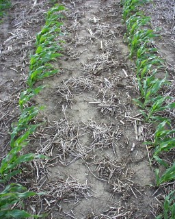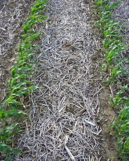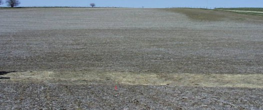 Here is a view of Nightcrawlers moving towards the hillside on a different farm. The darker colored area in the foreground is where the Nightcrawlers have gathered the soybean stubble into little mounds. There are no nightcrawlers on this sidehill yet but there is a small colony of them at the very top of the hill. The darker area in the upper right hand corner is tillage to repair an old washout caused by years of tillage.