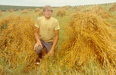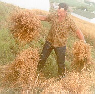 | Here Billy Wanninger is placing the bundles to dry. | Above the field is finished and the Oat Shocks will stand about a week to dry. |