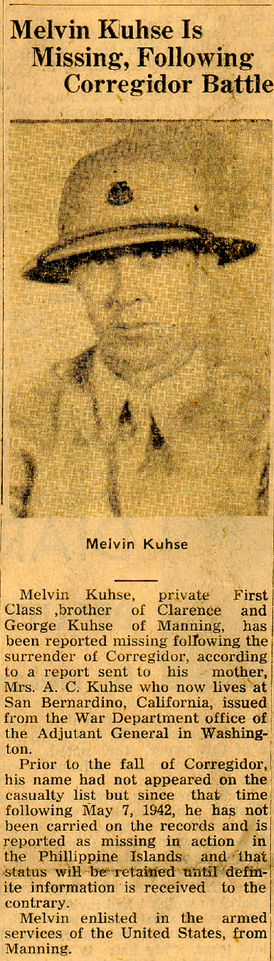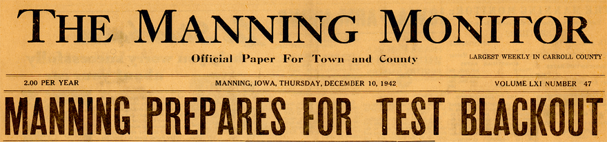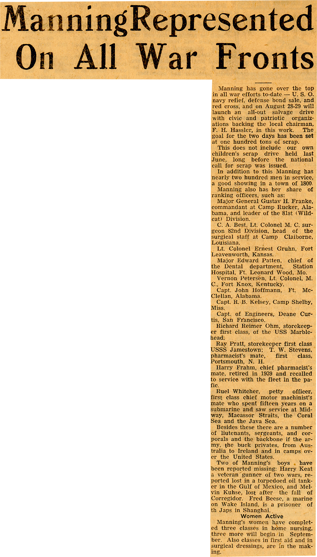 How many small communities do you know have published 5 history books? The first one was the History of Manning 1898, then the 1981 Manning Centennial book, next the 2006 Manning Quasqui book, and most recently the 2009 Manning School history book. Probably the last book to be published will be the upcoming Manning Veterans' book - unless someone comes forward in the next generation to take over these projects after I'm gone. Will you help with the Veterans' history book project? If you are a Manning connected Veteran or are presently serving and do not submit your military connected pictures and infomation you probably won't be in this once-in-a-life-time Manning Veterans' history book. With a limited number of volunteers we can only do so much on our own but will try to get pictures of as many Veterans as we can. There are over 1000 Manning Veterans so we have a long ways to go before the book can be published.