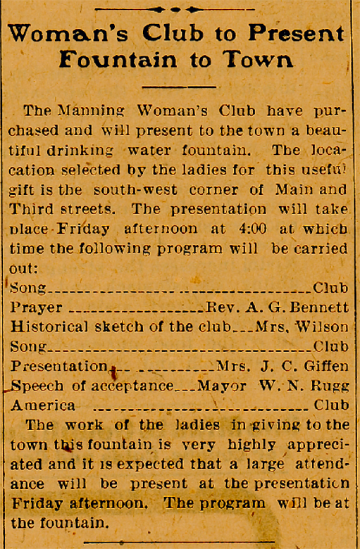the Manning Woman's Club in a few well-chosen words presented the fountain to the city of Manning.