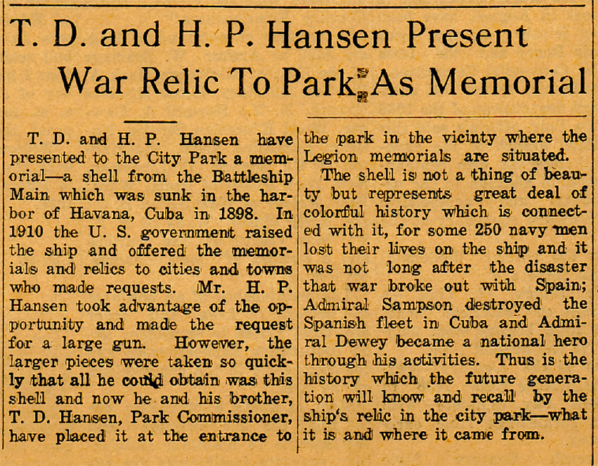 It was from the Battleship Maine and acquired by brothers Theodore D. and Herman P. Hansen,