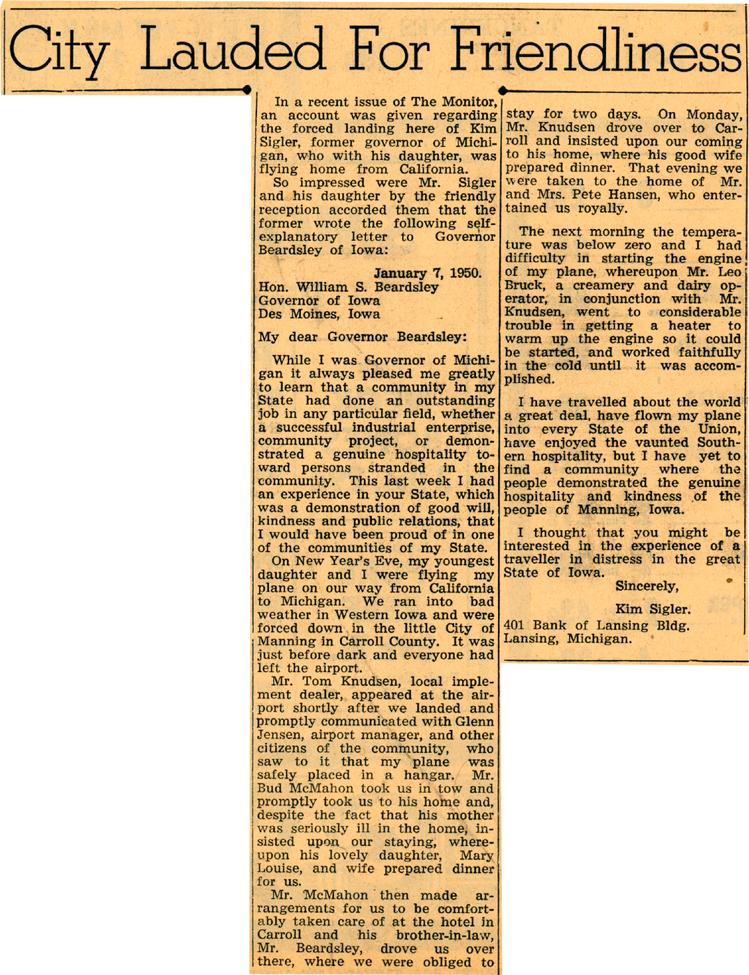 January 19, 1950, Manning Monitor