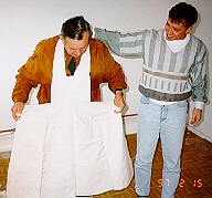 | Here Peter and Jürgen show one of the aprons that was stored in the cream cans. |