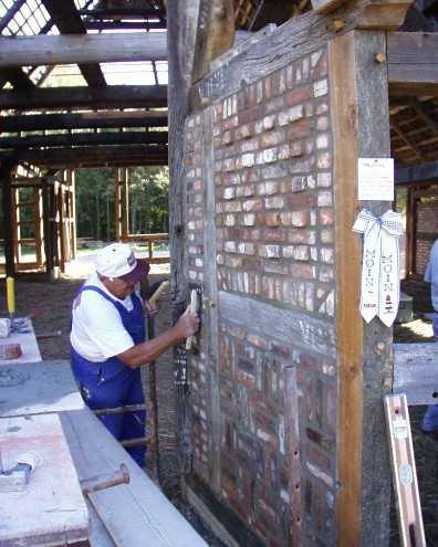 Original Haus/Barn Bricks Layed - Heinz Olk brushing the mortor on the 1660's era bricks which were used in the construction of the Haus/Bam. Brick layers, Heinz Olk, Omaha, Nebraska; Michael Olk, Gretna, Nebraska; Karl Maass, DeWitt, Iowa; Bernhard Sauer, Pella, Iowa; and Rudy Kaut, Des Moines, began laying brick last Friday. Heinz Olk, as well as Maass, Sauer and Kaut, are all immigrants from Germany. All the men are brick layers by trade, except Kaut who is a tile setter by trade.