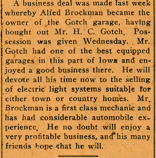 "Grandpa Stumpe had a dog that would pee on the light pole in front of the Gotch Garage -- 413 Main Street. So one day Herman Gotch wired the pole with a battery so when the dog would pee on the pole he would get a shock. After the dog got shocked he would no longer go up town." Harold Reinke |