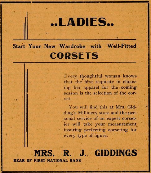 Basement: On the north side of the First National building there was a board walk with railing that went along the wall to the NW corner. In the first floor NW corner of the building was Giddings Millinery.