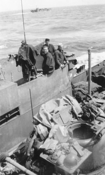 The 537 with a tank on the deck and in the distance on the waters of the English Channel is a transport ship. |