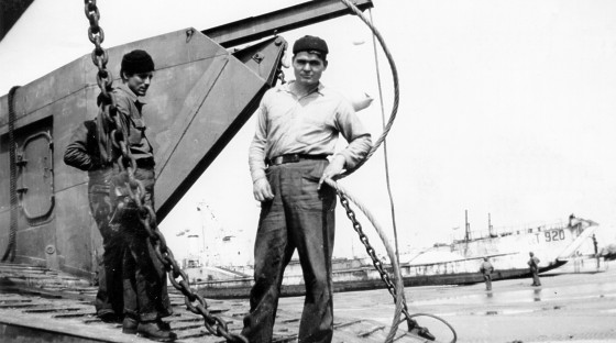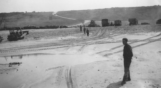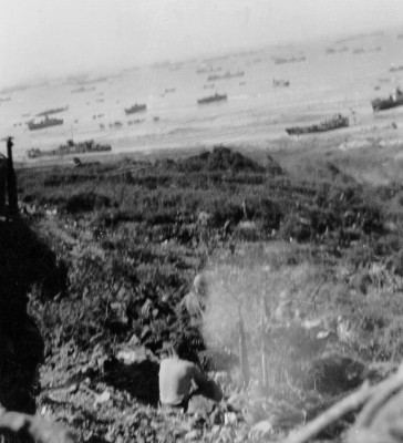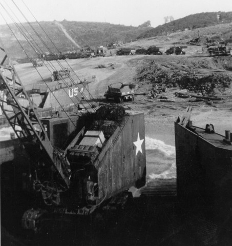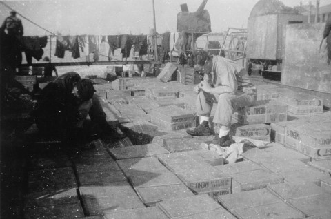 Bud Mohr sitting on hundreds of boxes of K-Rations being delivered to the Beach head.
