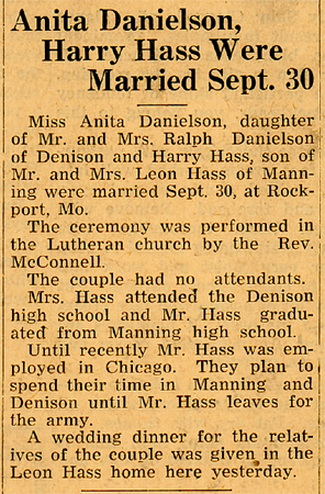 He was preceded in death by his parents; his wife, Anita "Babe" in 1996; his wife's parents, Ralph and Anita Helen Marie Mahoney Danielsen and Augusta Cassebarth Danielsen; one son-in-law, Keith Haynes; two brothers-in-law, Don Danielsen; and Ralph "Sonny" Danielsen and his wife, Irene; two sisters-in-law, Mary DeVinney; and Barbara Jane Danielsen. He is survived by his children, Portia Haynes of Van Meter, Iowa; Brynne Cue and her husband, David of Denison; Kirk of Harlan, Iowa; and Nile and his wife, Jane of Rossville, Georgia; eleven grandchildren, Bill Haynes and his wife, Lynne; Noel Haynes and his wife, Laurie; Cameron Haynes and his wife, Evette; Rise Drake; Lerynne West; Brent Haynes and his wife, Janel; Gillian Gillespie and her husband, Chad; Kollin Haynes and his wife, Karen; Travis and Trevor Hass and Colton Elsea; thirteen great-grandchildren; 7 great-great grandchildren; one brother, LeRoy Hass and his wife, Ruth of Milwaukee, Wisconsin; his sisters-in-law, Edith "Hon" Stamm and her husband, Jake of North Platt, Nebraska; and Judy Danielsen of Santa Clara, California; nieces and nephews; other relatives and friends.