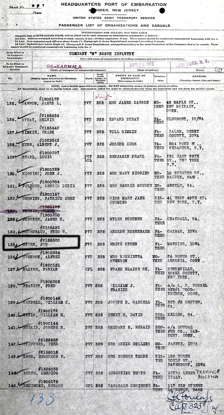 Departure April 25, 1918, at New York, New York, on the SS Karmala