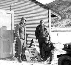 Meryl did become good friends with his ammo carriers, Jeff Goss from Crossville, Tennessee, Howard Silverstein of New York, and the tripod carrier, a Korean soldier, Sun Ho Tek. One night when they were out in the field, Meryl woke up about 2 a.m. and Jeff had decided to take Meryl's gun apart and clean it. The problem was that it was too dark to see to put it back together. Of course Meryl was quite alarmed with this, but when there was enough daylight they put it back together. They were just thankful that there were no raids that night.
