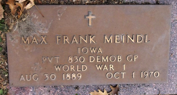 Buried with his wife Anna (Meiner) Meindl, at Riverside Cemetery, Marshalltown, Iowa