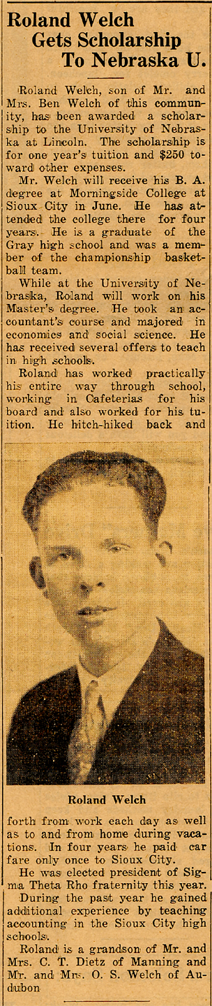 He was born March 17, 1914, at Manning, Iowa, to Benjamin and Abel (Deitz) Welch. He graduated from Gray High School in Iowa in 1931 and earned a bachelor of arts in accounting from Morningside College in Iowa in 1937. He then earned a master's degree in business administration at the University of Nebraska-Lincoln and began teaching at Kearney Normal College in 1939.