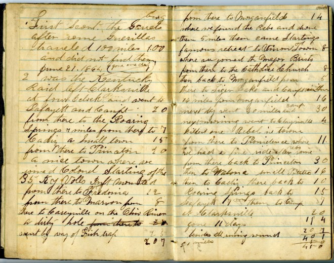 From there to Morganfield (14 mi.) where we found the Rebs and drove them 5 miles then came Startings famous retreat to Union Town (3 mi.) where we joined the Major Bristo, from there to the Catholic Church (8 mi.) then back to Morganfield from (5 mi.) there to tiger Lake and camped in, then 16 miles from Morganfield (16 mi.) next day went 30 miles and camp (30 mi.). Next morning went to Claysville (4 mi.). Killed one Rebel in town, from there to Providence where (11 mi.) we had a fine ride after some rebs, from there back to Princeton (30 mi.) then to Walona small potatoes (16 mi.) then to Cadiz, there back to (10 mi.) Roaring Springs back to (15 mi.) Lafayette 7 mi. then to camp (7 mi.) at Clarksville (20 mi.). Gone 11 days. Besides all running around 51 miles. (450 mi.)