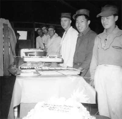 The Mess Tent included stoves, grills, and refrigerators powered by generators. It would reach 120 degrees inside the tent while they were working. Meals were fairly simple - hamburgers, ham, chicken, various cuts of beef, sliced potatoes with cheese sauce. Beef was shipped to them in swinging halves, and had to be cut up by the cooks. For Thanksgiving, the Chinese Nationalists brought in 27 live turkeys, arriving the night before the meal. The cooks spent the entire night killing, dressing, and cooling the turkeys, then making the full meal which also included shrimp cocktail, baked ham, mashed potatoes, sweet potatoes, bread dressing, gravy, peas, corn, relishes, hot rolls, pumpkin pie, mincemeat pie, and fruit cake.