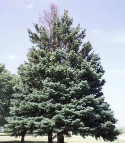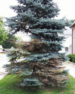 This 30 year old spruce tree started showing signs of Cytospora Canker this year. There are areas of dead branches throughout the tree. |