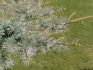 To the left is a Spruce tree infected with Rhizosphaera. This fungus usually preceeds Cytospora Canker by weakening the tree and making it an easy target for the deadly Canker. Needles become infected one year and the next year they turn a purplish-brown. First spray should be applied when new needles are half grown and again when fully grown. Rhizosphaera is easily controlled in 2 seasons unless the tree has become heavily infected. |