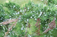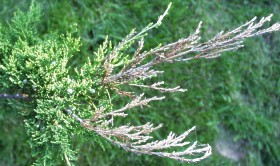 To the left is a Red Cedar infected with Kabatina. There is presently no effective spray and cutting out the dead ends will only increase infection. I have noticed an increase in Kabatina the last 2 years. |