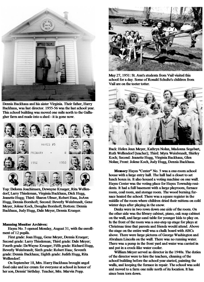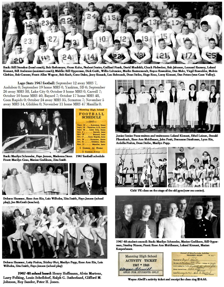 This 2006 Manning Quasquicentennial history book is an update to the 1981 Manning Centennial History Book. There are approximately 20 pages on city government, 11 pages on churches, 60 pages on the Manning school and Manning sports, 30 pages on entertainment & service organizations, 40 pages on Manning Veterans, 70 pages on Manning businesses, 10 pages showing the business layout and history of each building on Main Street, 10 pages on agriculture, over 200 pages on Manning's families, with the balance of pages composed of 100 year old Manning Monitor excerpts, random pictures, Manning nicknames, and advertisements. This 480 page history book is sewn bound with a hard cover and has excellent quality paper to give the best print for text and image quality for pictures. Many books of this quality would cost $60 to $100 but now the extra copies are on sale for $20 plus shipping. Nearly 100 volunteers worked on this history book project which was started before 2000. |