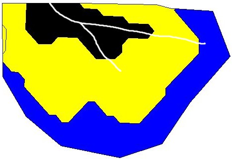 The Yellow color is 9D2 soil type which is 7.7 acres & 300 feet long at the widest point. The Blue color is 9B2 soil type which is 4.7 acres & 130 feet long at the widest point. The longest distance from the discharge into the top of our waterway to the top of the hill is 900 feet. |