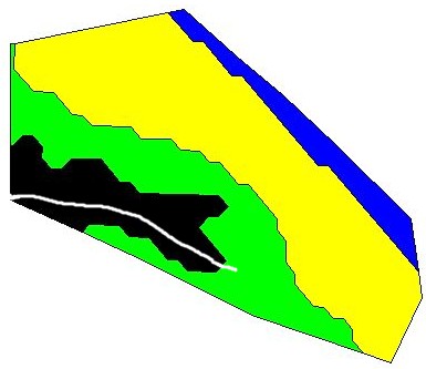 The Yellow color is 9D2 soil type which is 10.2 acres & 300 to 400 feet long at the widest point. The Blue color is 9B2 soil type which is 1.6 acres & 150 feet long at the widest point. The Green color is 9C2 soil type which is 5.5 acres in size The longest distance from the discharge at the bottom of the waterway to the top of the hill is 1330 feet. Here are the slope angles for the soil types.