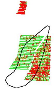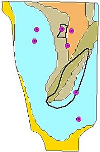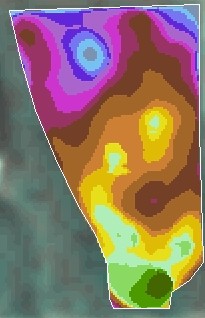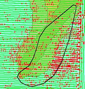 This is a 1999 soybean yield map. This 75 acre field averaged 48 bu/A The area marked on top is a suspicious low yield area.