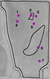 To the left is an ortho aerial image taken on 4/3/1990 at 6100 meters. There are 2 areas marked out in black. The magenta points are post harvest yield loss checks. (make note of # 1, 2 & 3) |