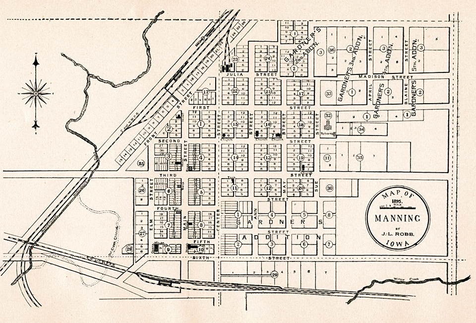 THE "Town of MANNING" was surveyed and platted in July, 1881. This survey included all of the east half of the S E 1/4 of Section 17, which lay east of the North Western right of way. The platted part consisted of Blocks 1 to 7 (sub-divided) and Block 8 (not subdivided). It appears that the starting point of the survey was the south half-section post of section 17, and that the south section line of this section was used as a base fine, as the streets and alleys run parallel with, and perpendicular, to this line.