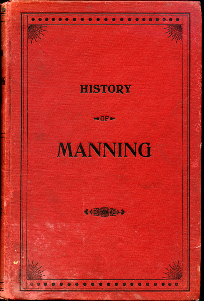 To Our Friends. In compiling this history of Manning, we have met with many discouraging problems, and have been compelled to overcome many difficulties; however, we hope and trust should any occur the public will overlook the little imperfections, that may have passed our scrutiny. Heretofore, many enterprises started under the name of "history" have turned out to be only advertising schemes and were composed principally of business-write-ups", biographies and cuts of those who were willing to pay well for them. This is not our plan. We expect to pay our expenses through the sale of the work, and in order to accomplish this end, we shall endeavor to make it a work of valuable information and record; granting favors to none, and treating subjects only to the extent that may be of interest to the public, and especially, to the coming generation; for the history that treats of the present or recent events may not be of as much interest at the present time as it will in years to come, as history which we help to make, does not appeal to us as such but simply as passing events, however, we shall endeavor to review many interesting accounts of the early history of the town, thus producing a record, that is not only of interest and value at the present time, but will increase in value as the years pass by. That which will be as valuable in the records as the reading matter, will be the illustrations which will be distributed throughout the work. These will consist of maps, Pictures of the town in 1882, a view of Main street in 1887, a view of Main street at the present time, the fire ruins of 1895, a number of views of the town at the present time, from elevated positions, also, our most prominent buildings, such as the school house and School, and numerous other cuts that space will not permit mentioning. We hope that the public will not permit themselves to be disappointed in not finding this to be a free will offering but will if they appreciate our efforts exhibit their appreciation by giving us a reason ably large subscription, for we trust that all will realize the expense that has already accrued in doing the public a service. What ever you will do for us in this line, will be thankfully received and productive of much encouragement to us.