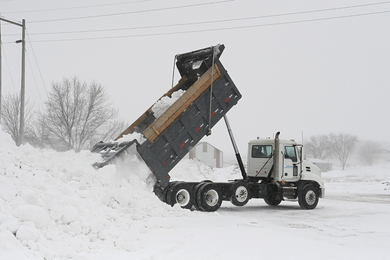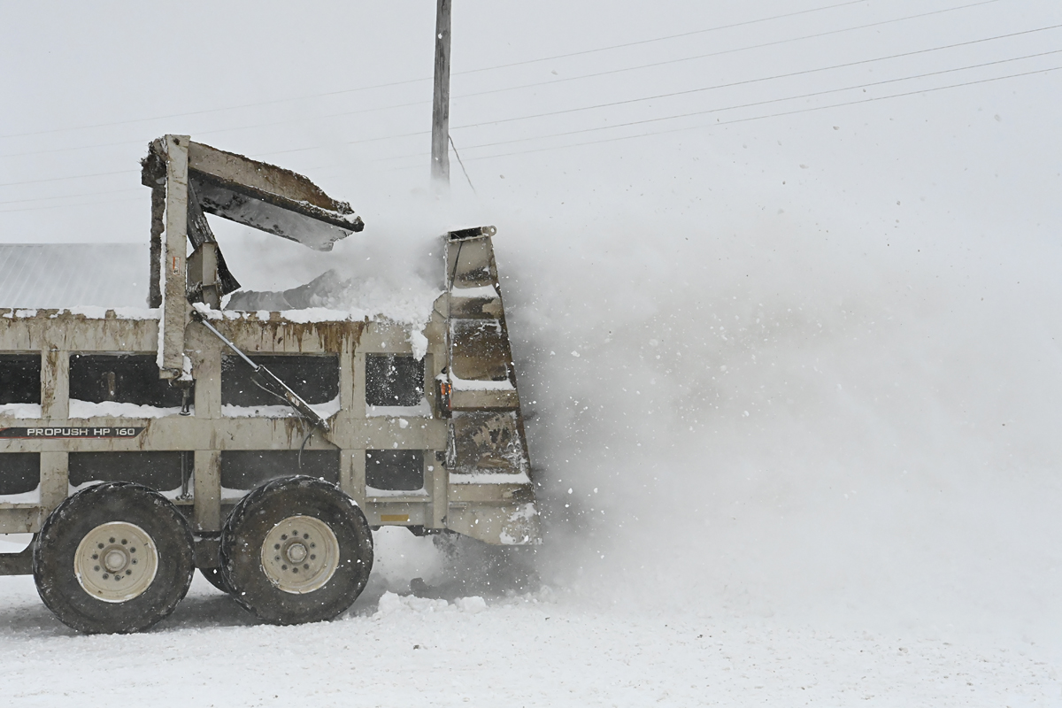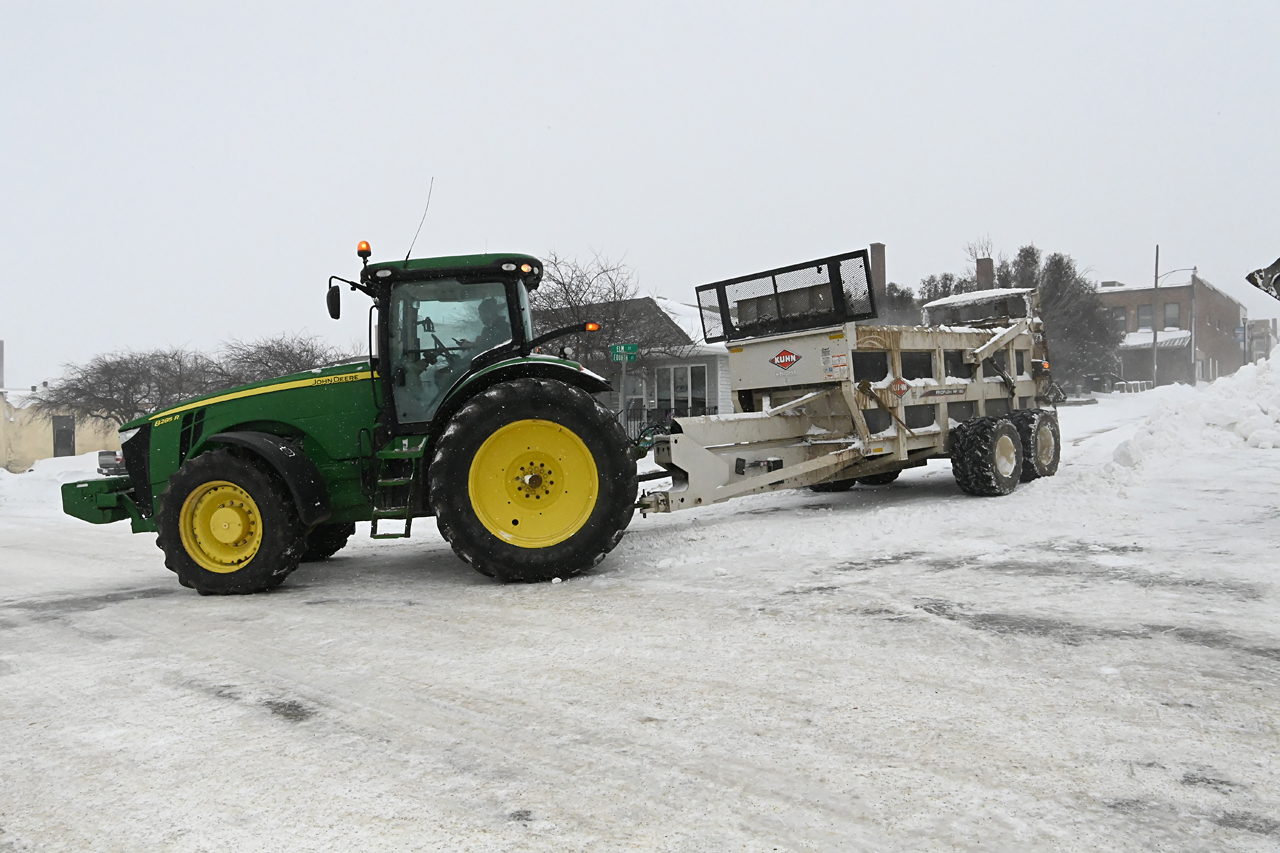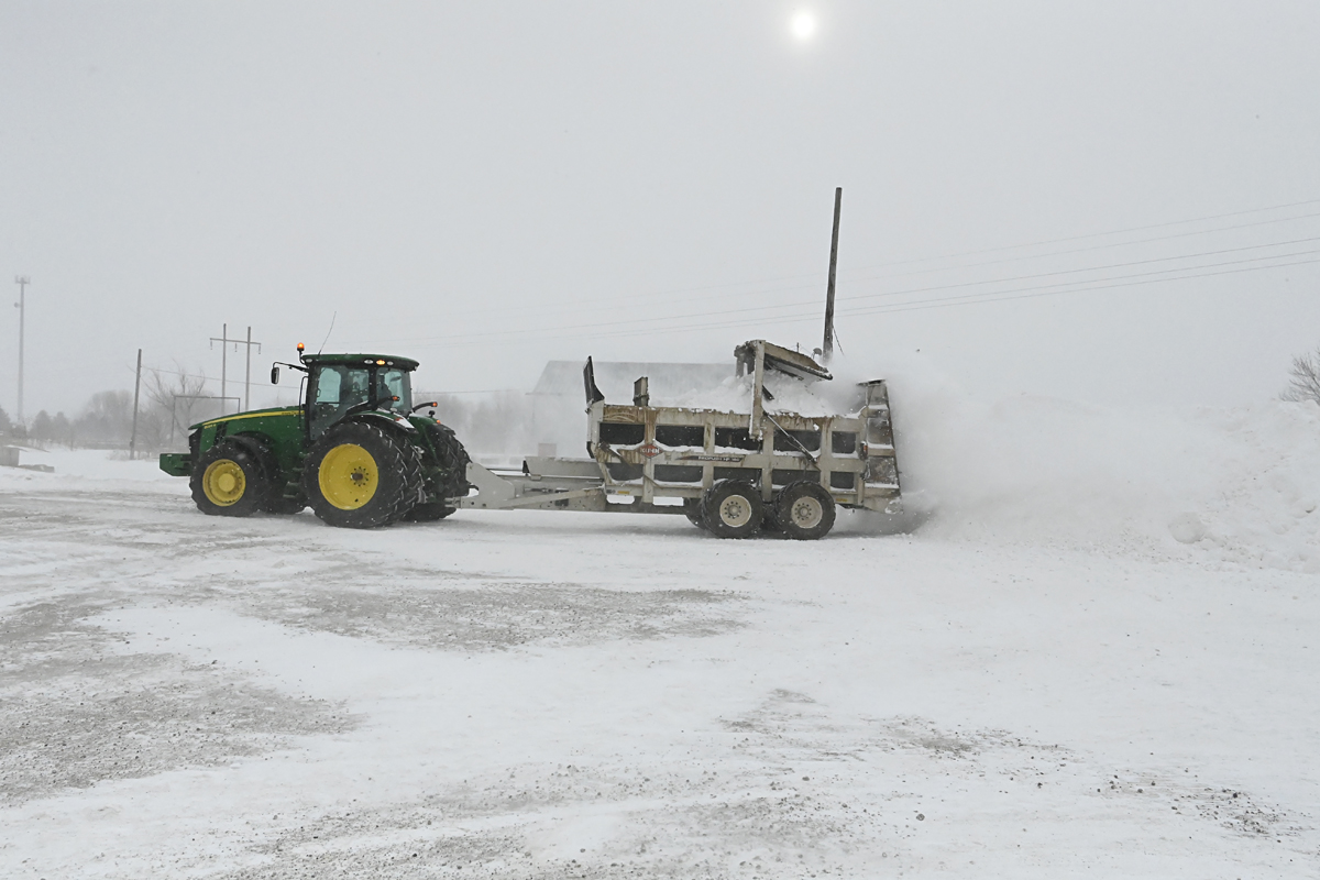 Leave it up to Midwest ingenuity and farmer thinking to use a manure spreader to help haul away the snow piles.