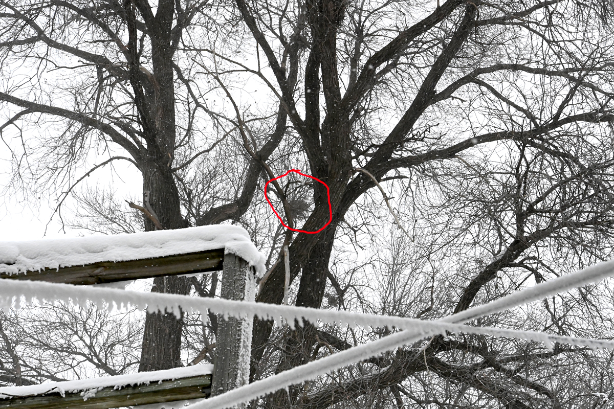 Red circle shows a squirrel nest - over the years I've only seen these nests get knocked down during extreme ice storms.